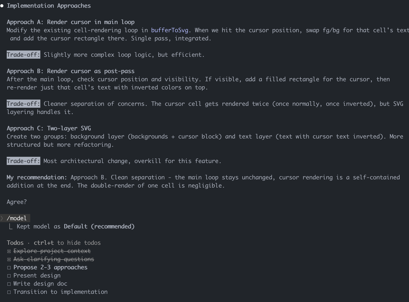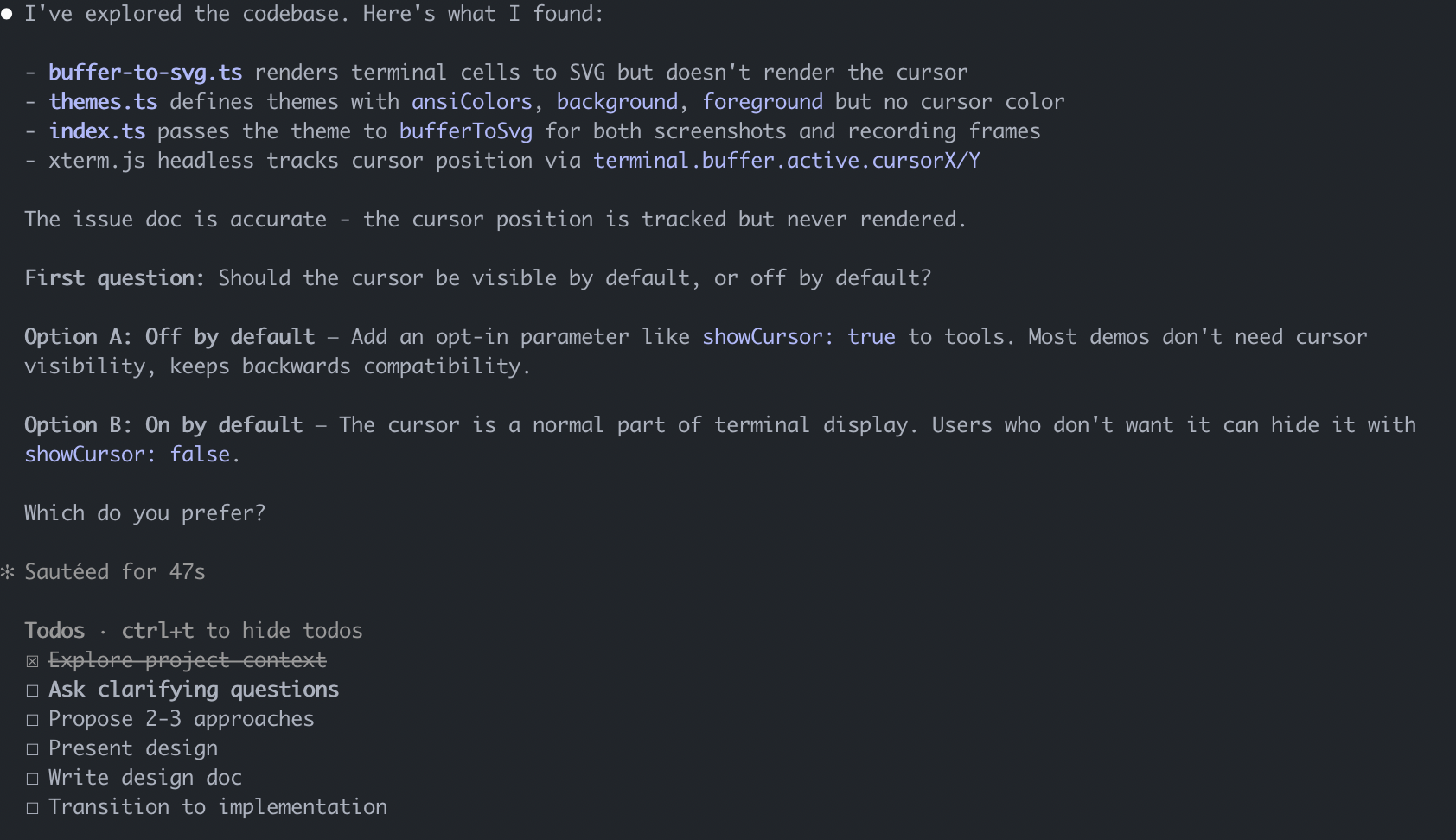 Interestingly here’s where superpowers (or to be fair, the LLM) struggled. An assumption had been made that the underlying terminal emulator (xterm.js) actually allowed you to check cursor visibility. When moving into the design the agent quickly decided that there is no visibility field exposed in the in the xterm API, and then suggested just always showing the cursor.