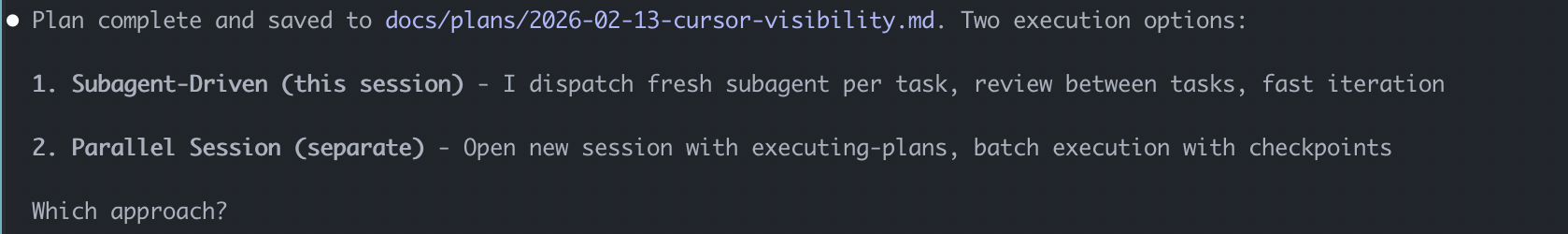 There was a bit more discussion around design, all common sense stuff. Finally a plan is written. You can see it in the pull request in docs/plans/2026-02-13-cursor-visibility-design.md.