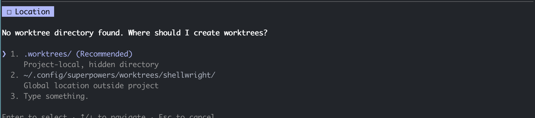 Additional skills are run to make sure we have a working location - Superpowers asks where we want to keep our Git worktree1. This is a really nice feature, I had something similar in one of my own protocols (creating a .sandboxes folder) but Superpowers is explicit with what is going on: