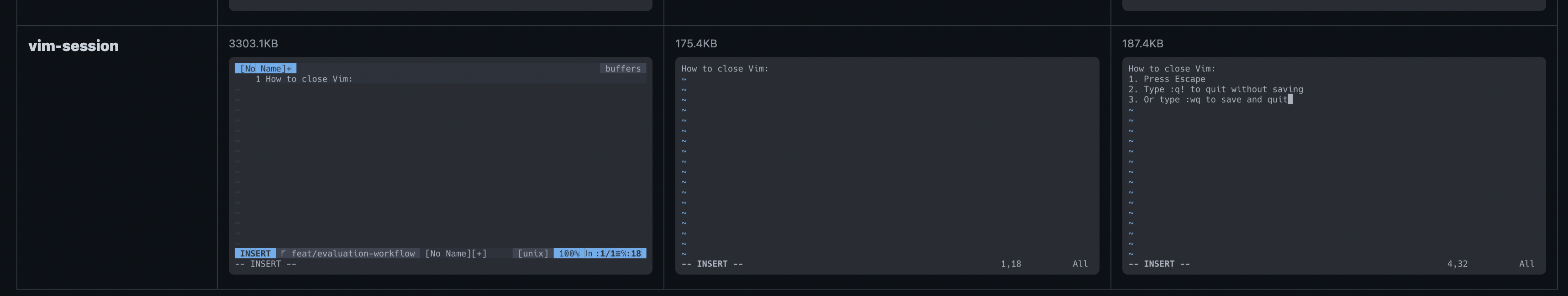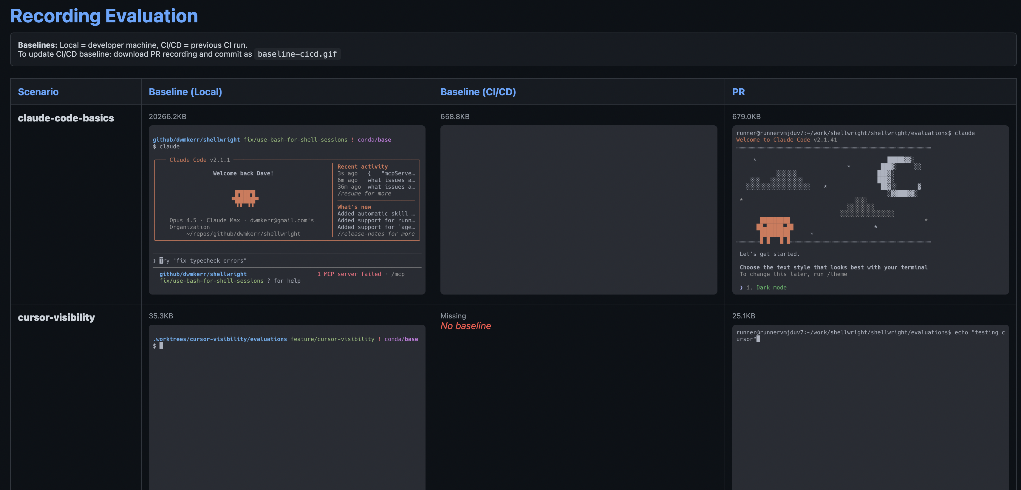 To handle more complex testing scenarios, I have prompts stored in markdown files. These are instructions that are passed during CI/CD to an agent that has the Shellwright MCP server installed. Each prompt produces a video, and I show a table in the pull request with the “before” and “after” for each scenario. This means I can eyeball how the videos look and get a sanity check that output is looking sensible. A table like this is added to pull requests: